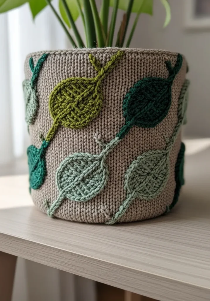 This knitted plant pot cover brings such a fresh natural vibe to a simple planter. The base is worked in a soft beige yarn with a smooth stockinette texture that fits snugly around the pot. Layered on top are raised knitted leaves in different shades of green, each one shaped and stitched on for a beautiful three dimensional effect. The leaf veins are defined with clever stitch work, giving them a realistic yet cozy look. The overall design feels earthy, textured, and perfectly balanced.