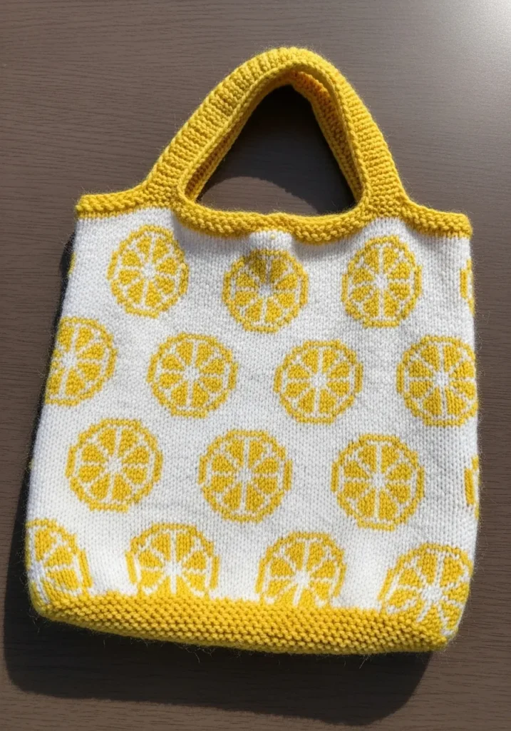 This knitted market tote is bright, cheerful, and full of summer energy. The body is worked in crisp white yarn with bold yellow lemon slice motifs scattered across the front and back. Each lemon is carefully shaped with simple colorwork to highlight the segments and rind. The top edge and sturdy handles are finished in a matching sunny yellow, giving the bag a clean and polished look. The stitches are smooth and even, with just a hint of natural yarn texture that makes it feel beautifully handmade.