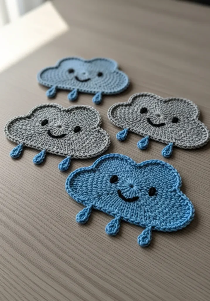 These knitted cloud coasters are almost too cute to set a cup on. Each one is worked in soft shades of blue and gray yarn, shaped into a puffy cloud with gentle rounded edges. The center features simple embroidered eyes and a curved smile that gives every cloud its own happy personality. Tiny knitted raindrops dangle along the bottom, adding a playful detail that makes them stand out from ordinary coasters. The stitches are neat and slightly textured, giving them that cozy handmade charm.