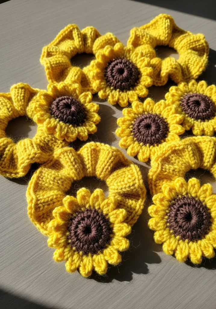 These knitted scrunchies are like little bursts of sunshine. Each one is made with bright golden yellow yarn that forms soft ruffled edges, creating that classic scrunchie shape with extra volume. Attached to the side is a detailed sunflower motif with a rich brown center and textured yellow petals that stand out beautifully. The stitches are plump and cozy, giving the flowers a lovely dimensional look. You can see the soft yarn fibers catching the light, which makes them feel warm and handmade.