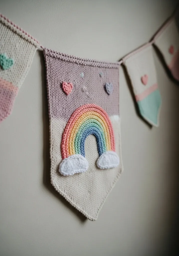 This knitted wall banner is pure nursery dreaminess. The base is worked in soft cream and blush pink yarn with a smooth stockinette texture that gives it a clean and cozy look. In the center, a raised pastel rainbow arches beautifully in shades of peach, yellow, mint, and baby blue. Puffy white clouds sit at each end of the rainbow, adding sweet dimension. Tiny knitted hearts and subtle stitch details bring even more charm to the design. The pointed bottom gives it that classic pennant shape, and the top is neatly attached to a knitted cord for hanging.