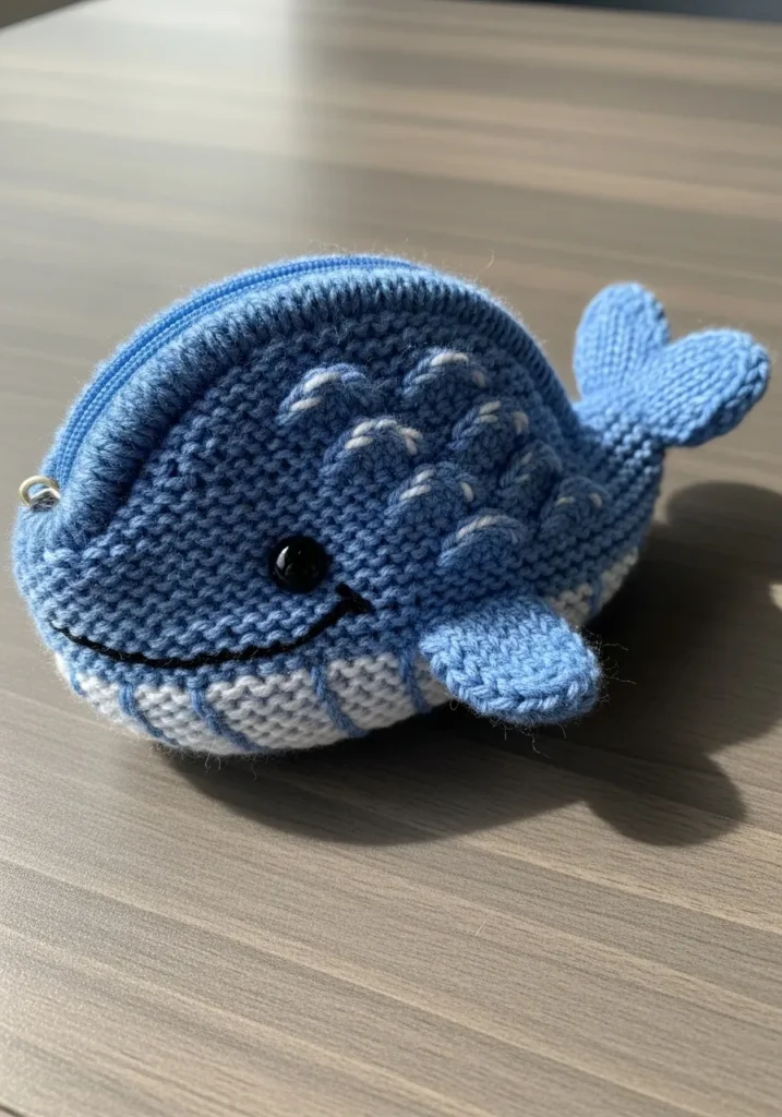 This knitted coin purse is shaped like the sweetest little whale. It is worked in soft ocean blue yarn with a rounded body and a lighter striped belly underneath. The surface features subtle stitched details that mimic gentle waves across its back. A tiny fin and curved tail are knitted separately and attached for that adorable three dimensional look. The glossy black eye and stitched smile give it a friendly personality, and a small zipper along the top keeps coins or earbuds safely tucked inside.