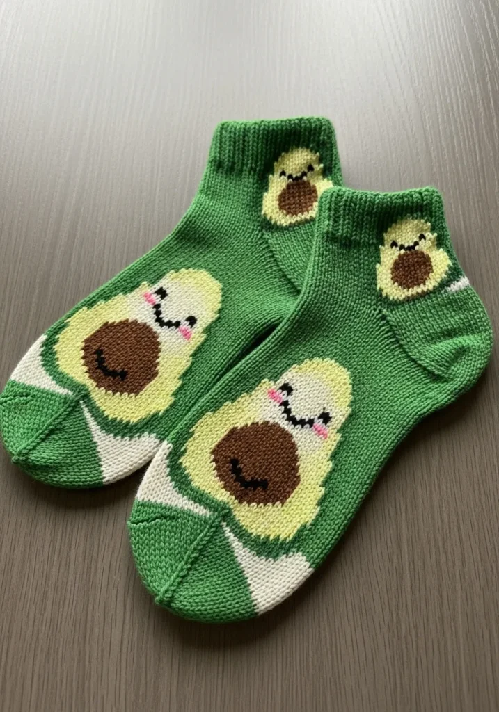 I honestly think novelty socks like these are such an easy win for selling. People love fun everyday items, and avocados still have that playful foodie appeal. If you are comfortable with basic sock construction and simple colorwork, this is totally doable. I can already picture these displayed at a craft market with a few other fruit designs. They are practical, adorable, and just quirky enough to make someone add them to their basket without a second thought.