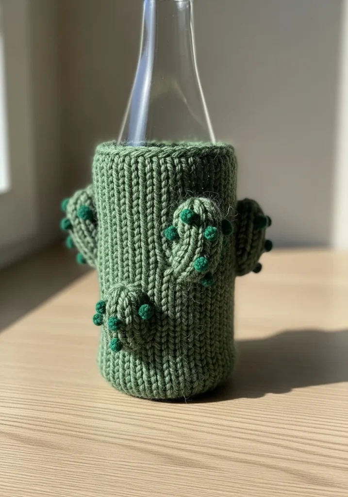 This knitted bottle holder is shaped like the cutest little cactus. The main body is worked in a muted sage green yarn with a vertical ribbed texture that hugs the bottle snugly. Small knitted cactus arms are attached on the sides, each decorated with tiny bobble stitches that mimic little cactus buds. The stitching is neat and slightly plush, with a soft halo of yarn fuzz that makes it feel warm and handmade. The snug cylindrical shape keeps drinks insulated while adding a playful desert inspired vibe.