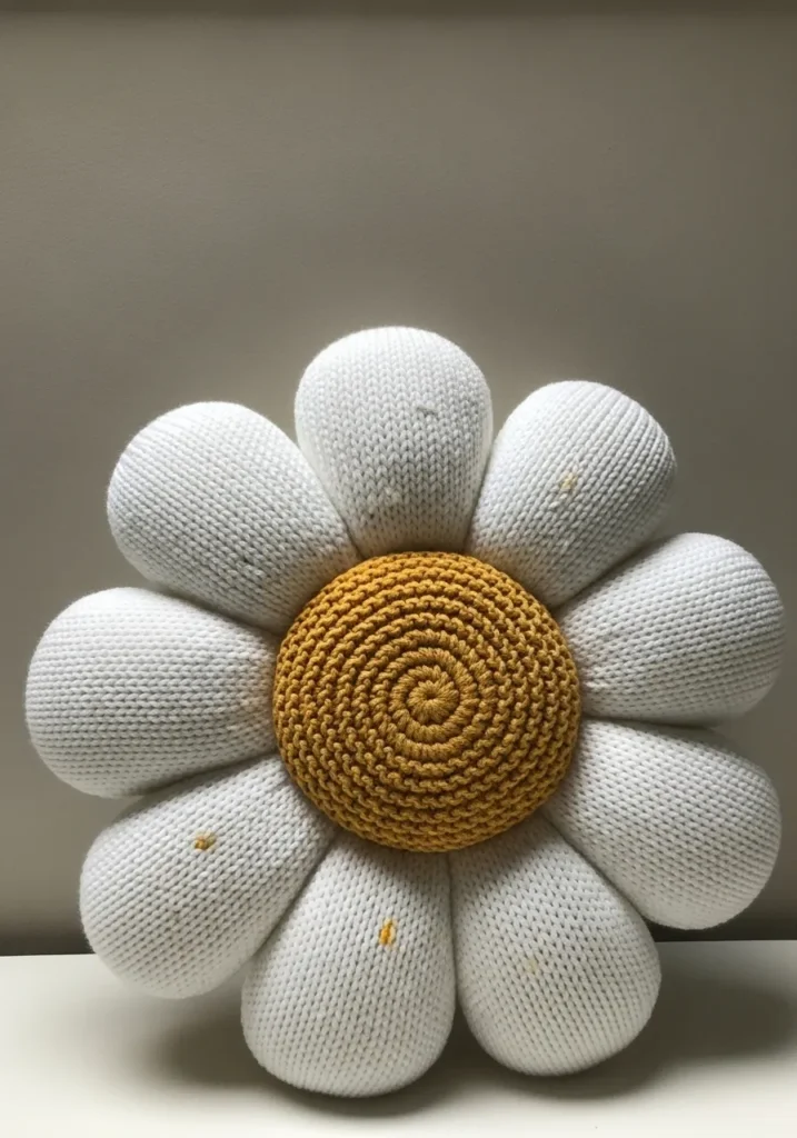 This oversized knitted daisy cushion is such a statement piece. The petals are worked in soft creamy white yarn and lightly stuffed to create a plump and pillowy shape. In the center, a textured mustard yellow circle is knitted in tight spiral rounds, giving it that classic daisy look with beautiful stitch definition. The contrast between the smooth petals and the richly textured center makes the whole design pop. You can even notice tiny flecks in the yarn that add to its handmade charm.