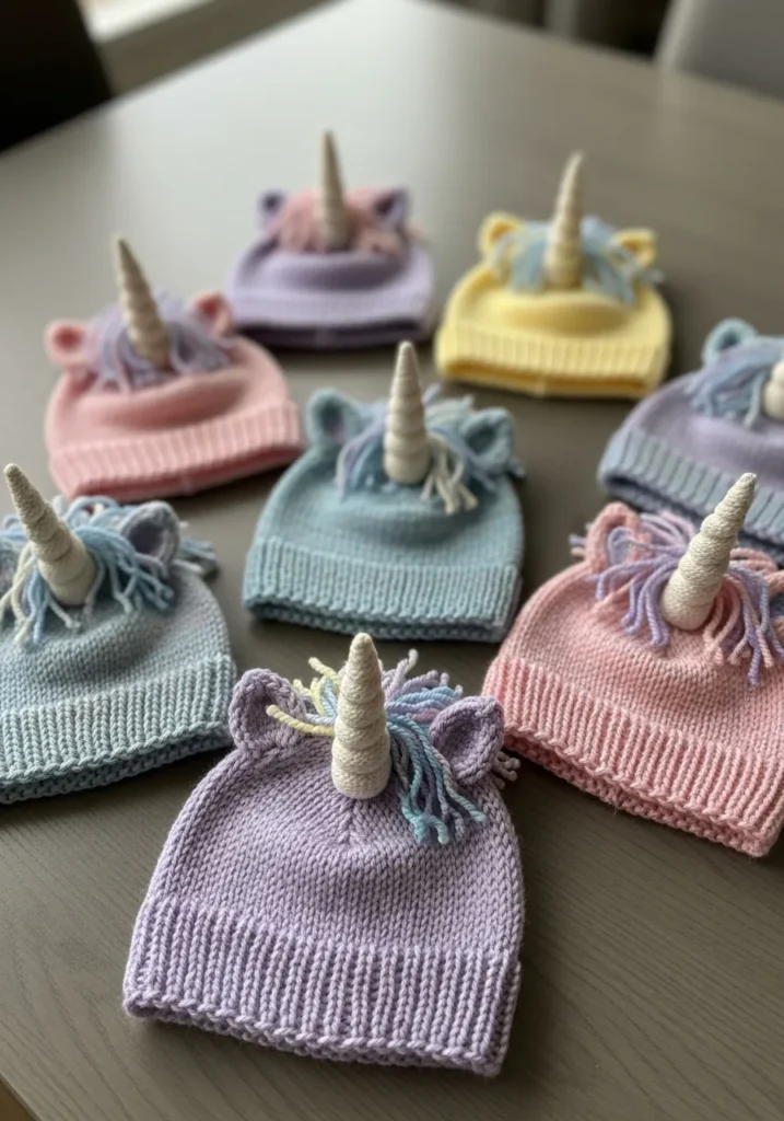 These knitted baby hats are pure magic in soft pastel form. Each hat is worked in gentle shades like blush pink, lavender, baby blue, mint, and pale yellow. The smooth knit body is finished with a stretchy ribbed brim for a snug and comfy fit. On top sits a softly stuffed spiral horn in creamy white, paired with tiny knitted ears and a playful yarn mane in mixed pastel strands. The texture is smooth and cozy, perfect for delicate little heads.