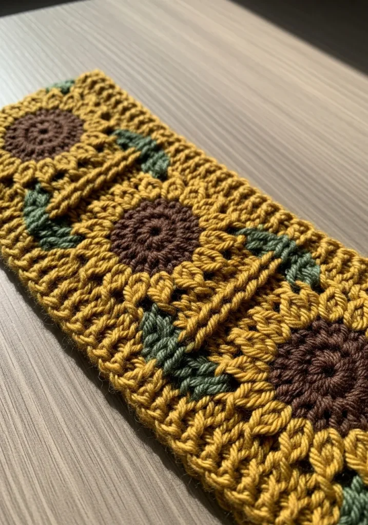 This knitted headband features bold sunflower motifs worked in warm mustard yellow with deep brown centers and leafy green accents. The flowers are textured with raised stitches that give the petals a lovely dimensional look. A thick ribbed band runs along the back for stretch and comfort, while the front panel showcases the detailed floral design. The yarn has a soft matte finish with subtle stitch variations that add to its handmade charm.