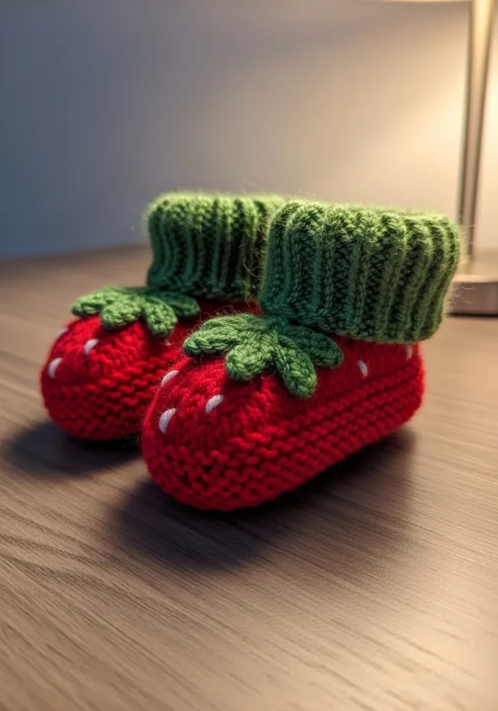 These knitted baby booties are designed to look like the cutest little strawberries. The body is worked in bright cherry red yarn with tiny white seed stitches scattered across the surface. The cuffs are knit in a rich leafy green with a thick ribbed texture that folds over softly at the ankle. Little green leaf details sit at the front, giving the illusion of a fresh strawberry top. The garter stitch sole adds extra squish and comfort, and you can see subtle yarn fuzz that makes them feel extra cozy and handmade.