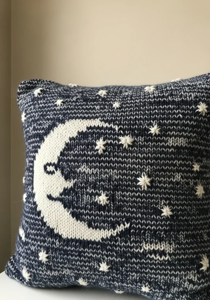 This knitted pillow cover features a dreamy night sky design with a large crescent moon worked in creamy white against a deep navy background. Tiny star motifs are scattered across the surface, creating a cozy constellation effect. The stockinette stitches give the moon a smooth, clean shape, while the surrounding background has a slightly marled texture that adds depth and visual interest. The edges are neatly finished, and the overall feel is soft, plush, and perfect for snuggling on a couch or bed.