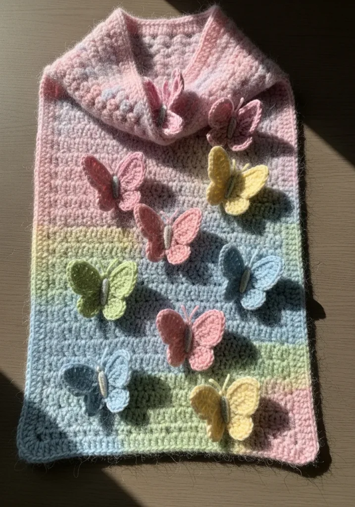 This dreamy scarf blends soft pastel shades from pink to yellow to blue, creating a gentle rainbow gradient along the fabric. Three dimensional butterfly appliques are attached across the front, each in coordinating pastel tones that add texture and charm. The stitches look smooth and even, giving the whole piece a light and airy feel.