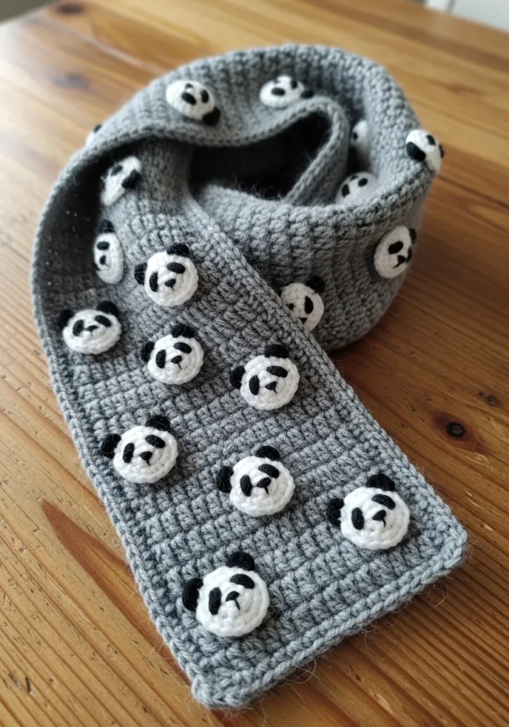 This soft gray crochet scarf is sprinkled with tiny panda face appliques that instantly make it feel fun and cozy. The base is stitched in a simple, tight pattern that keeps the structure clean and warm, while the black and white panda details pop beautifully against the neutral background. The length looks generous and easy to wrap, making it both practical and adorable for chilly days.
