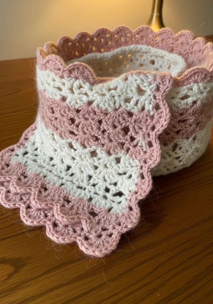 This delicate scarf combines soft pink and creamy white yarn in a lacy shell stitch pattern that feels romantic and airy. The scalloped edges add extra texture and femininity, while the openwork design keeps the piece lightweight and breathable. The alternating colors give it a gentle layered effect that looks sweet and elegant.
