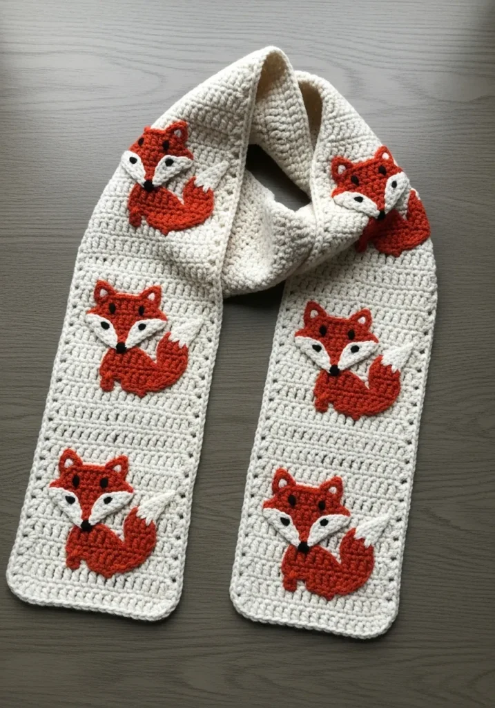 This soft ivory crochet scarf is brought to life with adorable fox appliqués stitched evenly along both ends, each one worked in warm shades of rust orange, white, and a hint of black for the sweetest facial details. The base features a neat, tight stitch pattern that gives it structure while still feeling flexible and cozy. The fox motifs sit slightly raised against the neutral background, adding texture and a playful woodland vibe without overwhelming the design. It feels charming, clean, and perfect for everyday wear with a touch of personality.