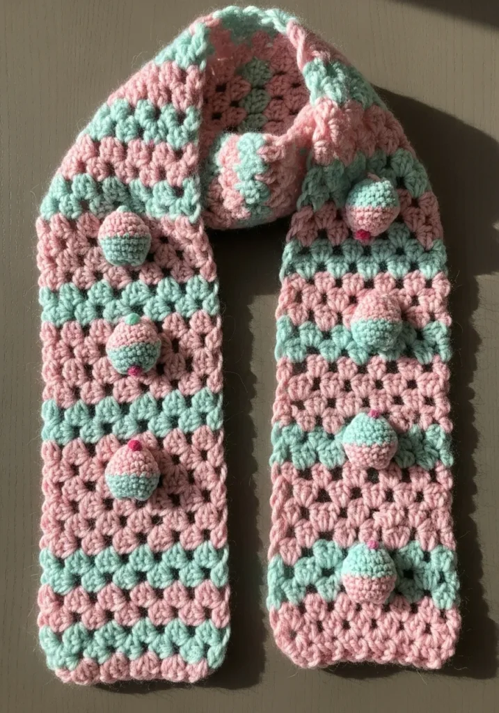 This playful mint green scarf is decorated with adorable crochet ice cream cone appliques spaced evenly along the length. The base is stitched in a classic, clean pattern that keeps the focus on the colorful details, while the tiny cones pop with pastel pinks, browns, and creamy tones. The overall look is soft, cheerful, and perfect for adding a fun twist to a simple outfit.