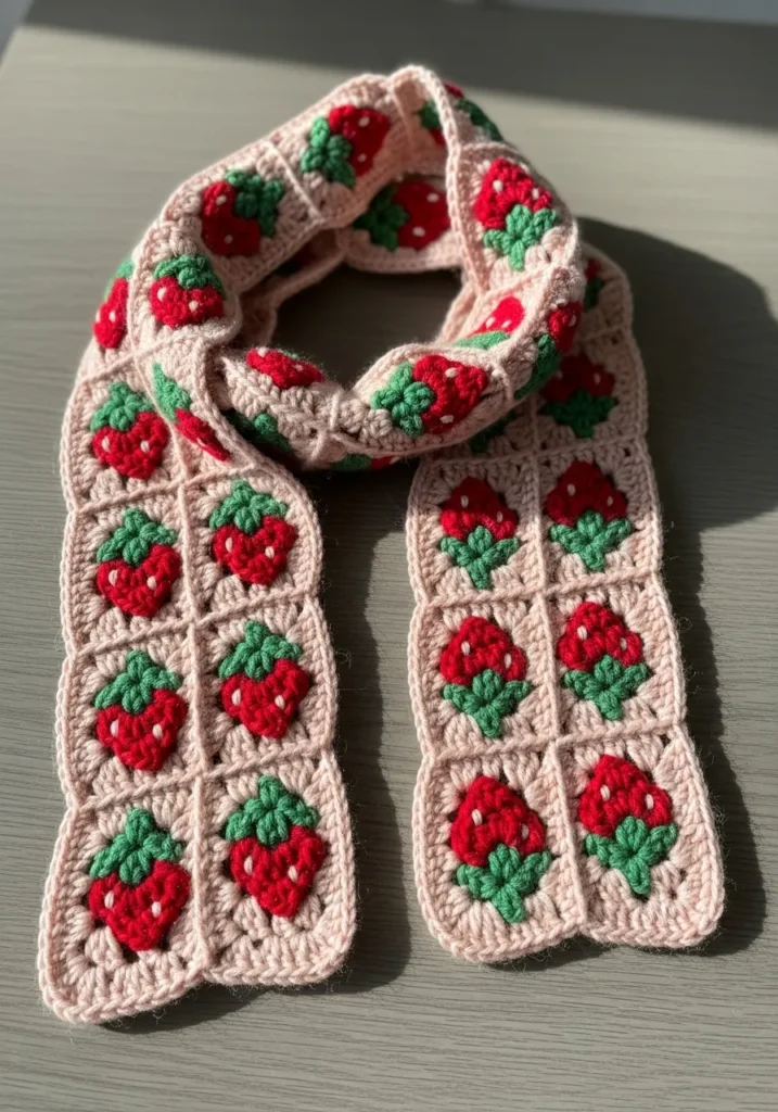 Some people love subtle accessories, but I have a soft spot for pieces that feel this cute and bold. This scarf is such a creative way to practice granny squares while making something wearable. I think it would look amazing with a simple white tee or denim jacket. Every time I see those little strawberries, I feel like I made something straight out of a cozy handmade market.