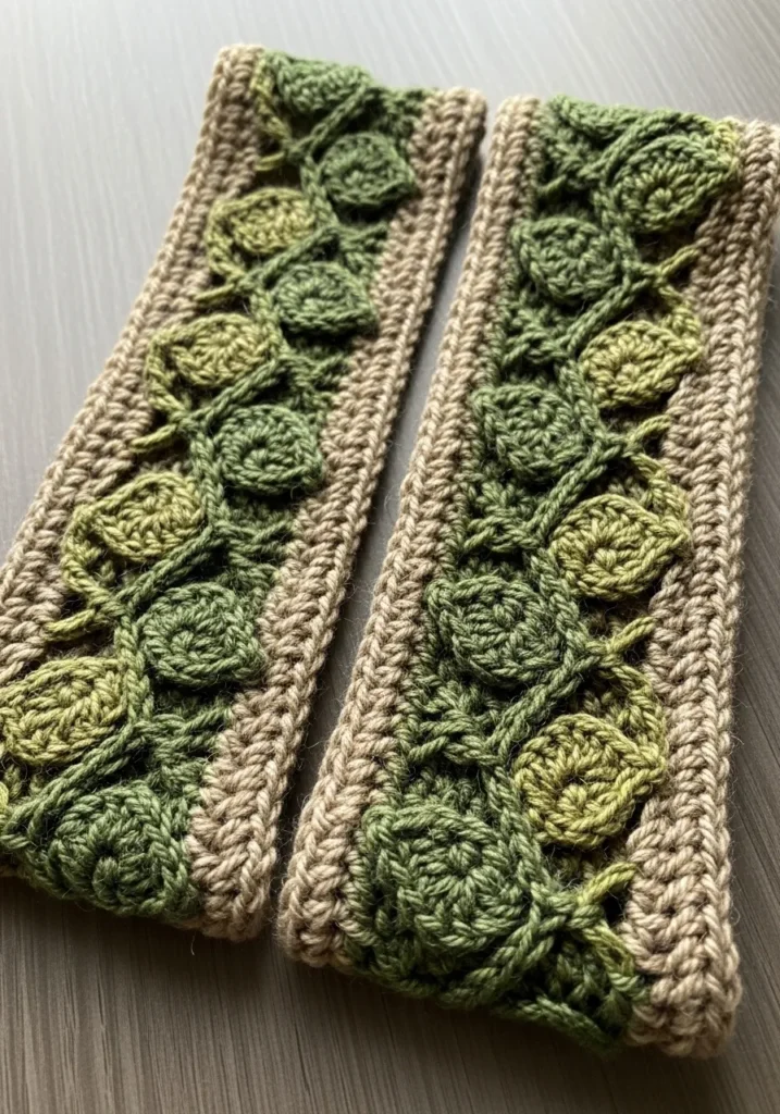 This cozy green scarf features a rich leafy stitch pattern that runs beautifully along the length, creating a raised texture that almost looks like tiny vines climbing across the fabric. The yarn appears soft and slightly chunky, giving the piece warmth and structure, while the earthy sage and olive tones make it feel grounded and natural. The edges are neatly finished with a simple border that frames the intricate design and keeps everything looking polished and intentional.