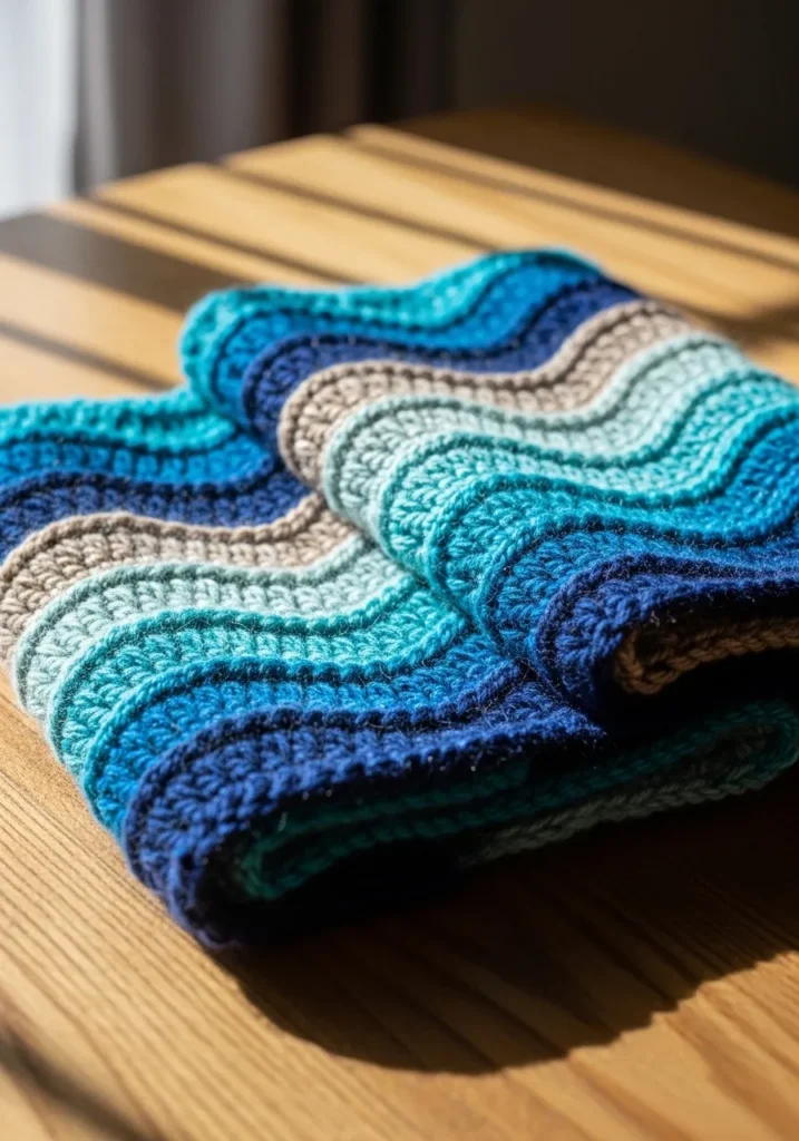 If you are into calming color palettes, this design feels so soothing to crochet. I find ripple patterns incredibly relaxing because once you get the rhythm down, it just flows. Wearing something that reminds me of the sea on a chilly day sounds like pure comfort.