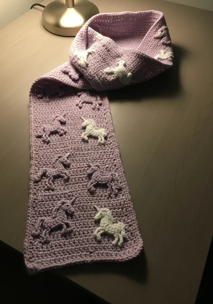 This dreamy lavender crochet scarf features a neat, tightly stitched base that gives it a soft yet structured feel, making it perfect for everyday wear. Scattered across the length are raised unicorn appliqués in matching lavender and creamy white yarn, each one carefully shaped with flowing manes and tiny legs that add the sweetest touch of dimension. The simple rectangular design keeps the focus on the magical details, while the gentle pastel color palette makes the whole piece feel cozy and feminine.