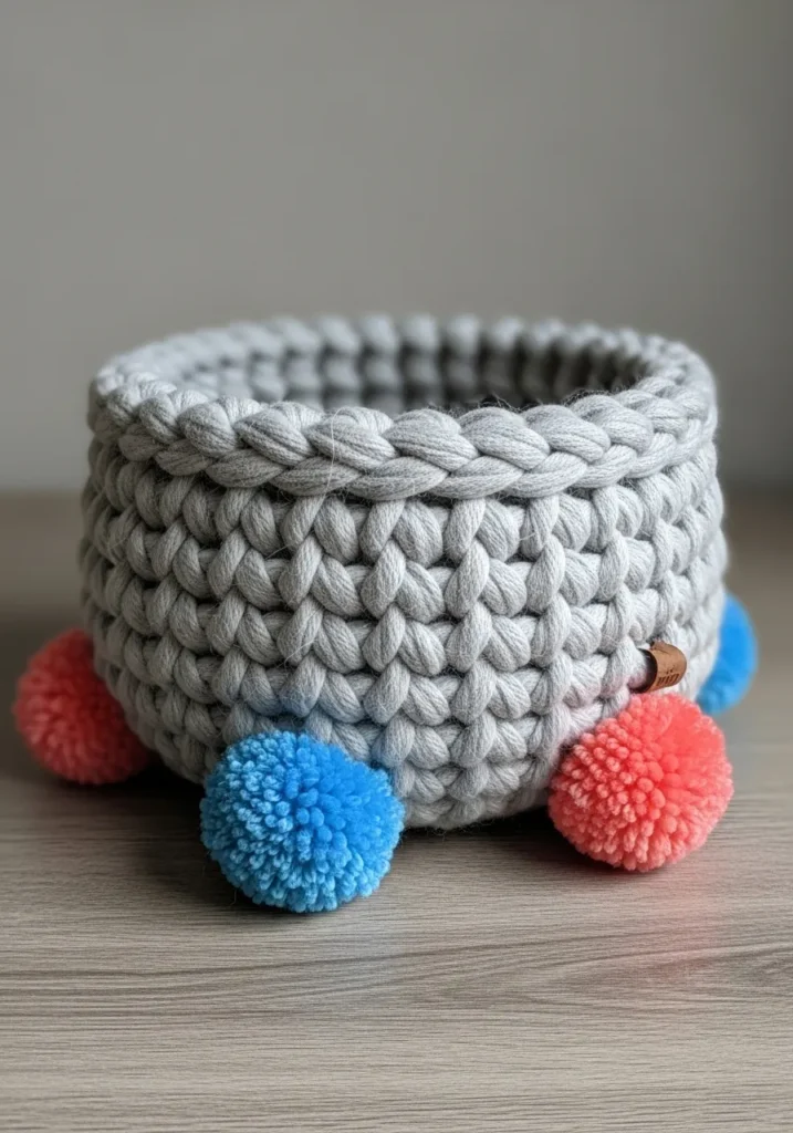 This chunky knitted storage basket is made with thick light gray yarn that gives it a sturdy and cozy feel. The stitches are bold and tightly packed, creating a strong structure that still looks soft and inviting. Bright pom poms in cheerful blue and coral peek out around the base, adding a playful pop of color and personality. The round shape keeps it versatile and cute while the chunky texture makes it feel extra handmade and special.