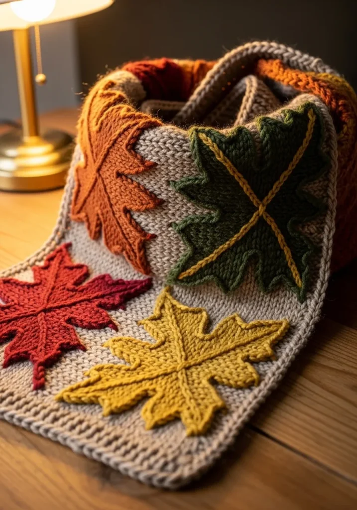 This chunky knitted scarf features a soft neutral base brought to life with raised autumn leaf motifs in warm shades of mustard yellow, deep red, burnt orange, and forest green. The leaves are stitched on top with bold texture, giving the scarf a layered and cozy look that really stands out. Thick yarn and large stitches make the whole piece feel plush and comforting, while the color palette keeps it seasonal and inviting without feeling over the top.