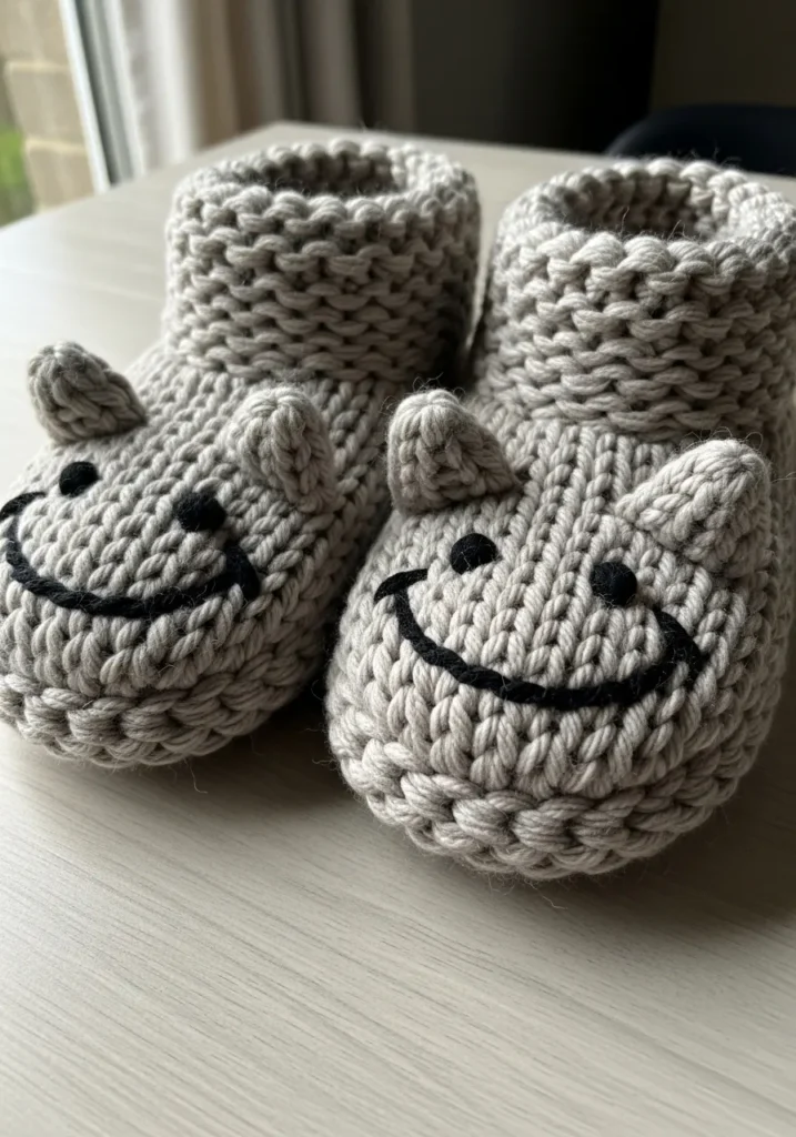 These chunky knitted slippers are shaped like sweet little bears, made with thick light gray yarn that looks soft and cozy. The rounded toes give them that plush teddy bear look, while small knitted ears and simple stitched smiles add so much personality. The stitches are bold and textured, making the slippers feel warm and sturdy. The cuffed tops keep them snug and comfortable, perfect for lounging around the house.