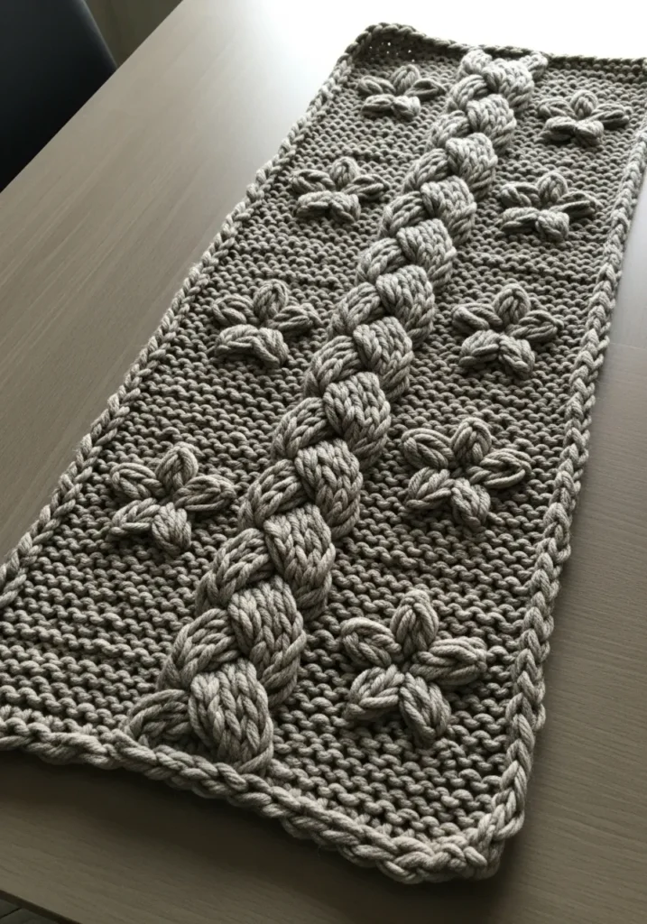 This chunky knitted table runner is made with thick soft gray yarn and features a bold braided cable running straight down the center. Small raised flower like stitches are scattered across the surface, adding texture and a gentle decorative touch. The edges are neatly finished, and the overall look feels cozy and handmade while still clean and modern. The chunky stitches give it a rich texture that instantly warms up a table or sideboard.
