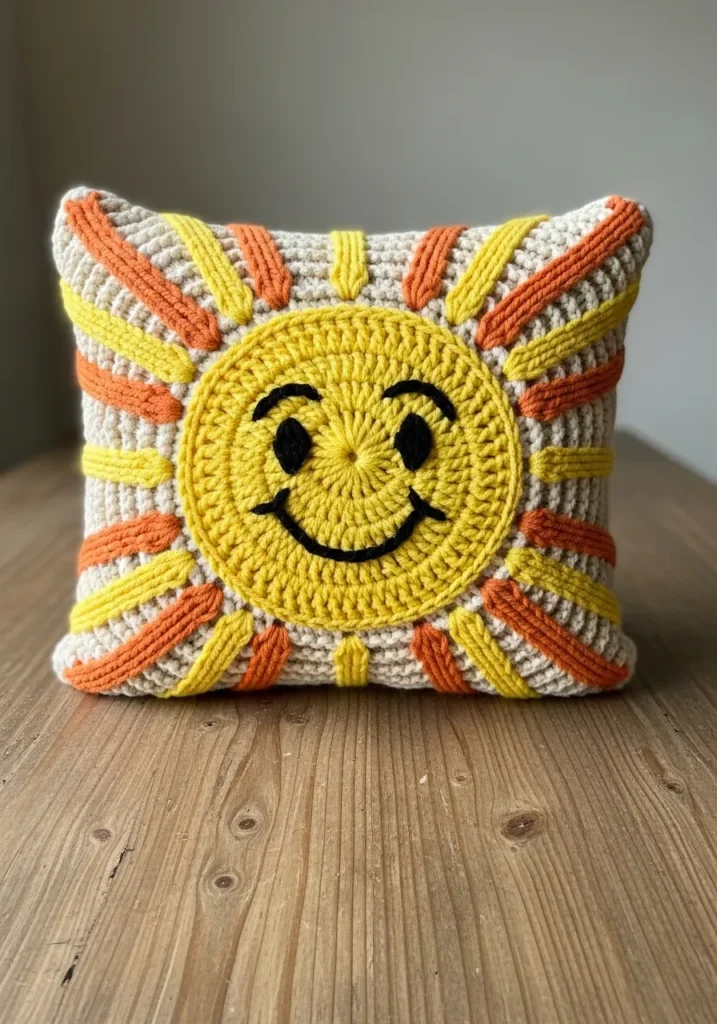 This chunky knitted pillow features a cheerful sun design with a bright yellow circular face and simple stitched eyes and smile. Thick cream yarn forms the base, while raised rays in warm yellow and soft orange stretch outward for extra texture and dimension. The stitches are bold and plush, giving the pillow a cozy handmade feel that instantly stands out on a sofa or bed. The square shape keeps it practical while the sunny face adds pure personality.
