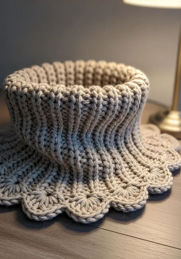 This chunky knitted neck cowl is made with thick soft gray yarn and features a wide ribbed section at the top that folds over for extra warmth. The lower edge is finished with a sweet scalloped border that adds texture and a gentle decorative touch. The stitches are bold and plush, giving the whole piece a cozy handmade look that feels both practical and pretty. The neutral color keeps it versatile while the scalloped edge adds just enough charm.