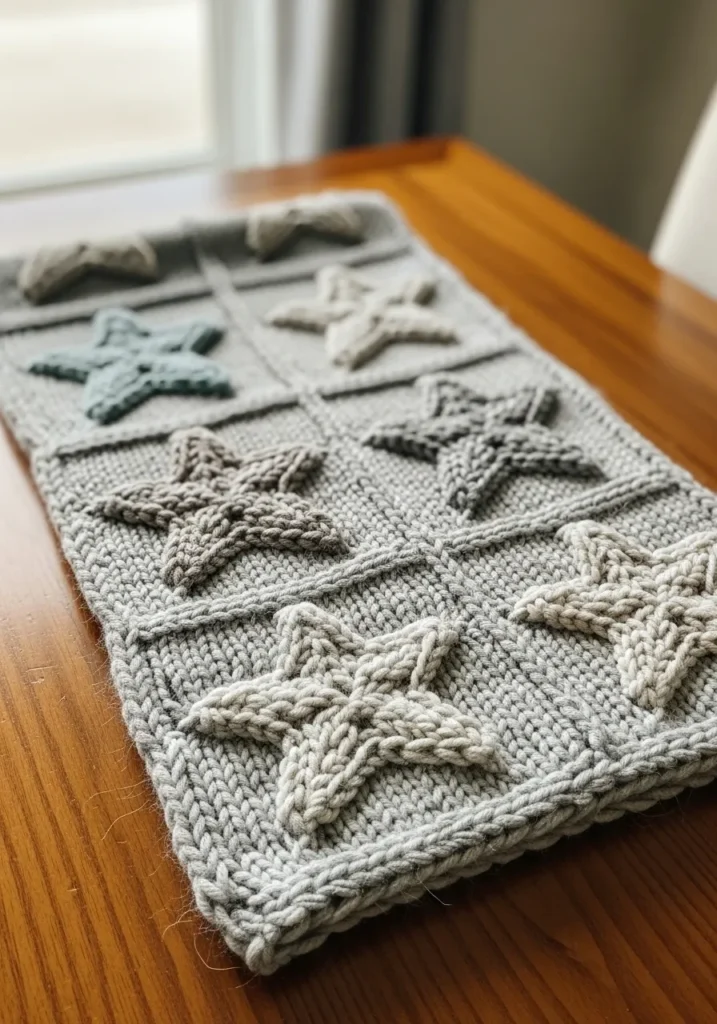 This chunky knitted table runner is made with thick soft gray yarn and features raised star patches stitched across the surface in slightly varied neutral tones. The bold stars add texture and dimension, while the clean rectangular shape keeps the design feeling balanced and modern. The stitches are large and plush, giving the whole piece a cozy handmade look that works beautifully on a dining table or console. The subtle color variation keeps it interesting without overpowering the space.