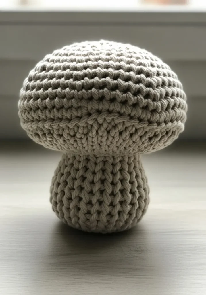 This chunky knitted mushroom is made with thick neutral yarn that gives it a soft sculptural look. The rounded cap sits on a sturdy stem, with tightly worked stitches that create a smooth and cozy texture all around. The simple shape keeps it clean and modern, while the chunky stitch size makes the design feel warm and playful. It looks like a little piece of cozy forest decor that fits perfectly on a shelf or table.