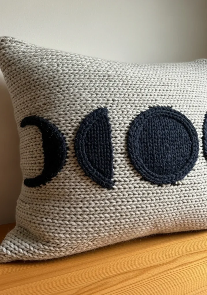 This chunky knitted pillow features a soft light gray base with bold moon phase shapes stitched across the front in deep navy yarn. The raised circles and crescent forms add texture and contrast, creating a clean but eye catching design. The stitches are thick and even, giving the pillow a cozy handmade feel while keeping the overall look modern and calming. The rectangular shape makes it perfect for layering on a sofa or bed.