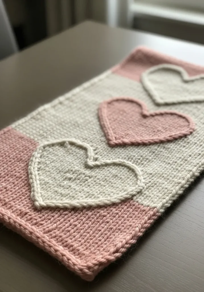 This chunky knitted table runner features a soft rectangular base in cozy cream with wide blush pink borders at each end. Raised heart shapes are stitched on top in matching cream and dusty pink, giving the surface a lovely textured look that really pops. The yarn is thick and plush with visible stitches that feel warm and handmade. The overall design feels sweet but still modern, perfect for adding a gentle cozy touch to a table or sideboard.