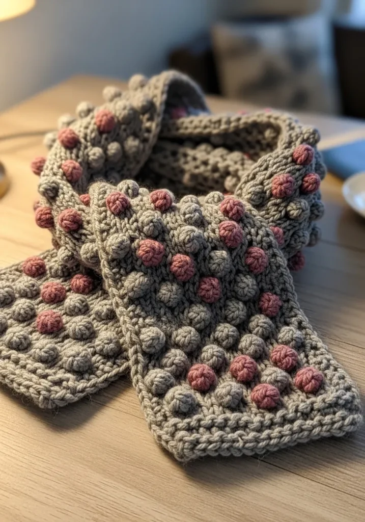 This chunky knitted scarf is made with thick soft gray yarn and covered in raised bobble stitches, with subtle blush pink accents scattered throughout. The texture is rich and playful, with each bobble popping off the surface and giving the scarf a cozy almost cloud like look. The chunky stitches keep it warm and plush, while the neutral base color makes it easy to wear with just about anything.