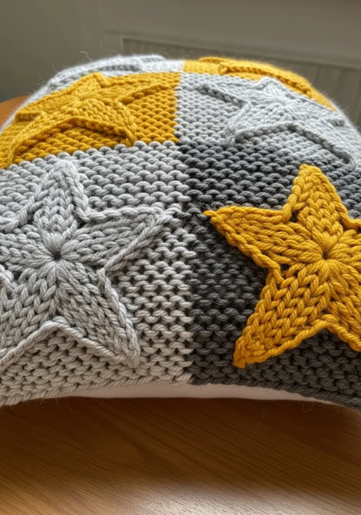 This chunky knitted pillow features a soft neutral base in layered shades of cream and gray, topped with bold raised star patches in mustard yellow and pale gray. The thick yarn creates a beautifully textured surface with clear stitch definition that feels cozy and inviting. Each star stands out with its sculpted shape and slightly puffed look, giving the pillow a playful handmade feel while still keeping a calm modern color palette.