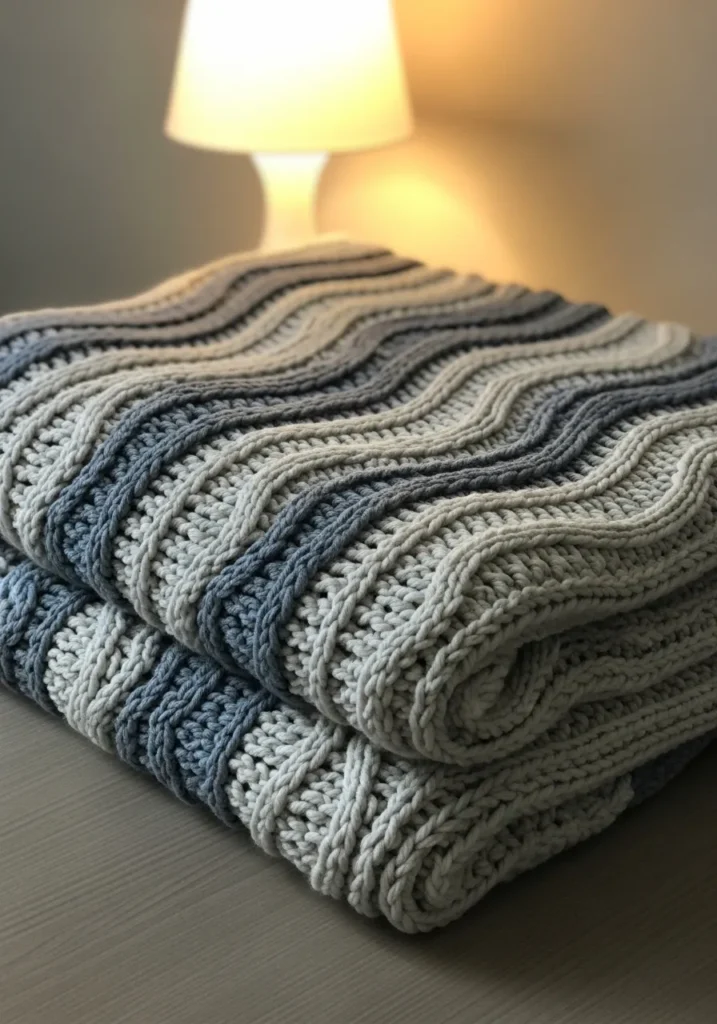 This chunky knitted throw blanket is made with thick yarn in soft shades of cream and muted blue gray, creating a calm and cozy look. The raised cable pattern runs across the surface in gentle waves, adding lots of texture without feeling too busy. Each stitch is bold and defined, giving the blanket that plush heavyweight feel that makes it perfect for layering on a bed or folding over the arm of a sofa. The overall design feels classic and comforting with a modern chunky twist.