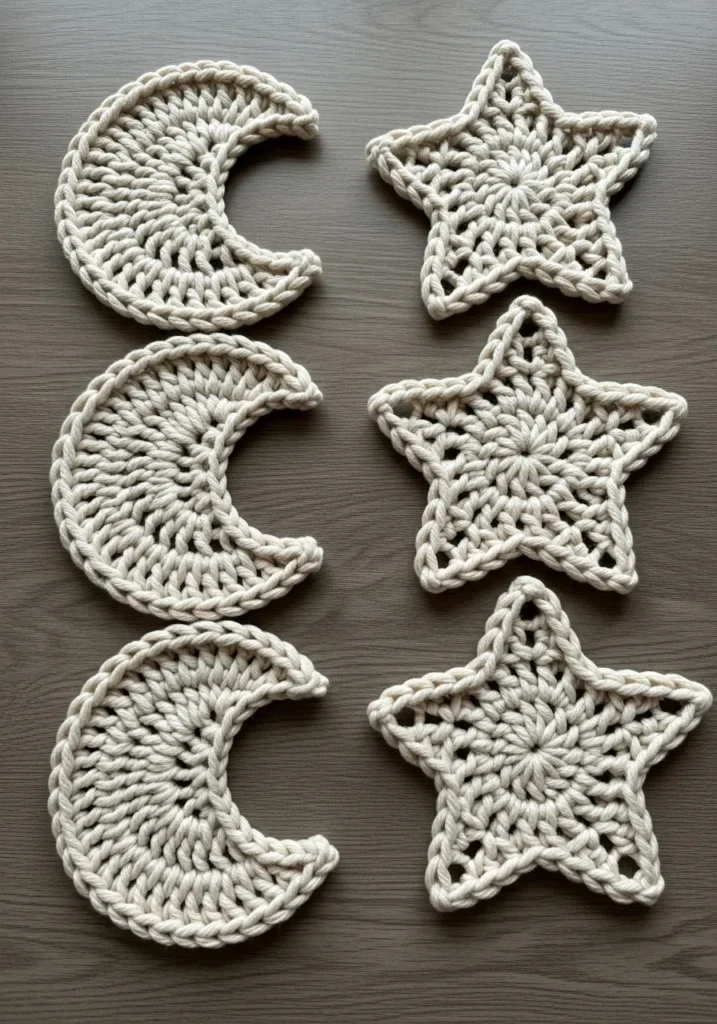 These chunky knitted coasters are shaped like sweet crescent moons and playful stars, all made with thick cream colored yarn. The stitches are bold and textured, giving each piece a soft sculpted look that feels cozy and handmade. The edges are slightly raised, which helps define the shapes and adds a nice finished touch. Laid out together, they feel calm and whimsical at the same time, perfect for a cozy table moment.