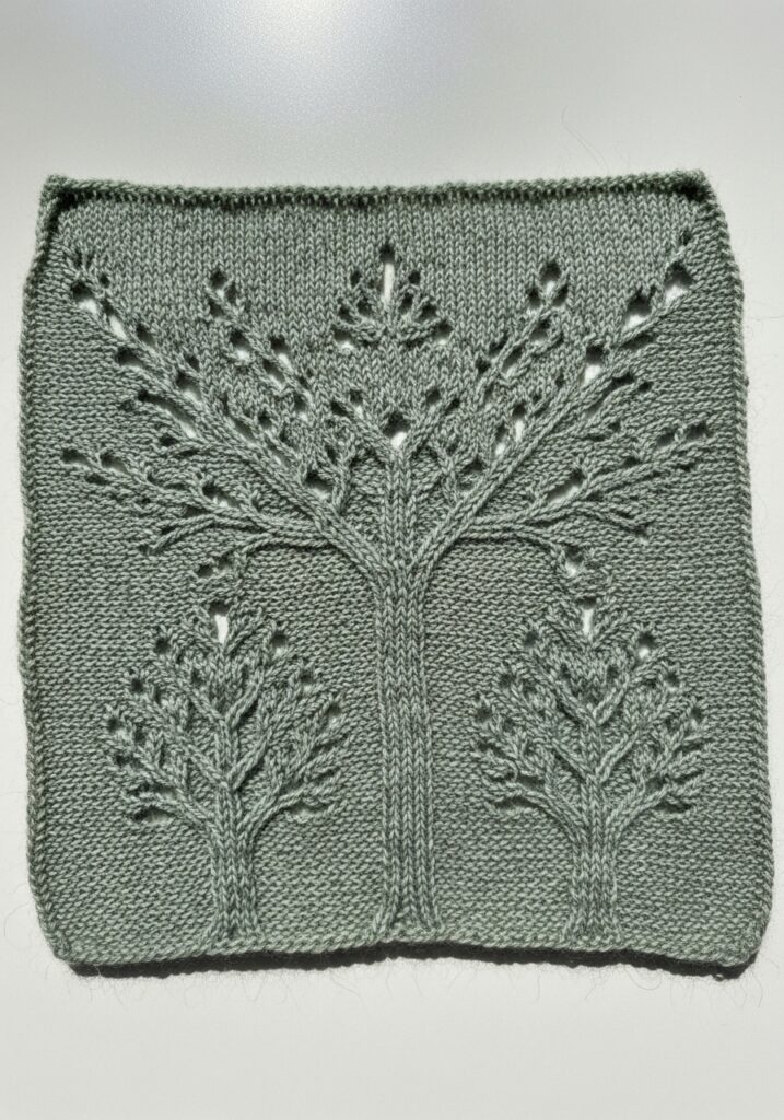 This knitting square is genuinely one of the most magical things I have ever seen come off a pair of needles, and the soft dusty sage green yarn makes it look like something straight out of an enchanted forest. The design features a stunning tree of life motif worked entirely in lace, with a central trunk that splits into graceful branches spreading outward and upward across the whole square, each branch tipped with delicate little leaf clusters formed by the most beautiful yarn-over eyelets. Smaller companion trees flank the central motif on either side, filling the background with this incredibly lush, layered woodland scene that honestly looks more like fine embroidery than knitting at first glance. The yarn appears to be a smooth DK or light worsted weight with a lovely matte finish that keeps all that intricate lace detail crisp, clear and perfectly defined against the stockinette background.