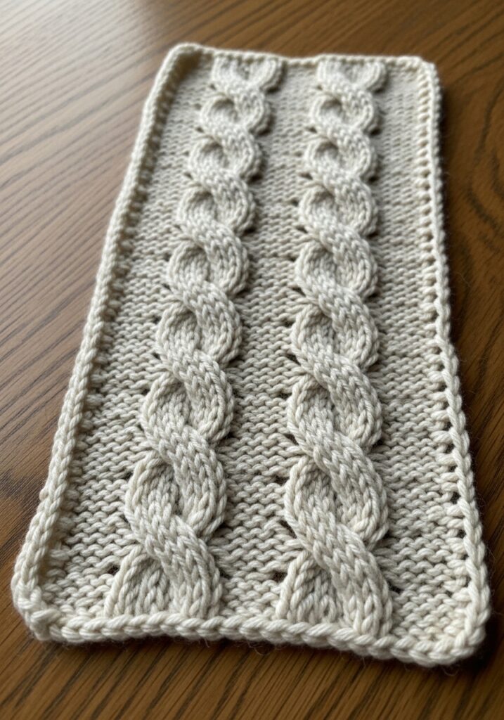 I love this pattern so much because it strikes that perfect balance between looking impressively intricate and actually being really enjoyable to knit once you settle into the repeat. The horseshoe cable is one of those classic shapes that just never gets old, and having two columns running side by side gives the project this lovely sense of symmetry that feels really pleasing to work on. This would make the most gorgeous scarf, a chic headband, or a beautiful table runner that would look right at home in a Scandinavian-inspired interior, and the soft oatmeal color is so versatile that it genuinely goes with absolutely everything without even trying.