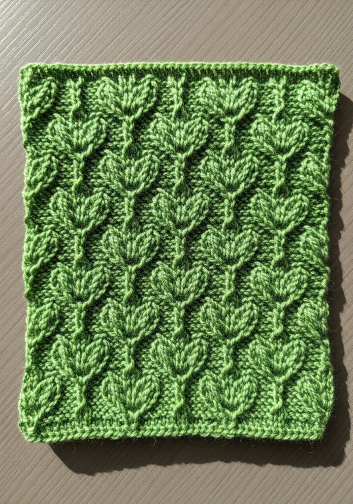 I am completely in love with allover stitch patterns like this one because they give you that incredible full-coverage texture without any complicated stitch manipulation or cable needles, and this leaf pattern is such a perfect example of that. Once the repeat clicks in your brain it honestly just flows row after row, and the way the fabric builds up into this gloriously textured surface is so rewarding to watch. I think it would be beyond gorgeous worked into a chunky throw blanket, a market bag, or a structured tote, and the bright apple green color makes it feel so fresh and contemporary that it would look equally at home in a modern apartment or a cozy cottage kitchen.