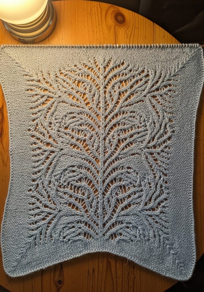 Giant Peacock Feather Lace Knitting Square in Dusty Blue