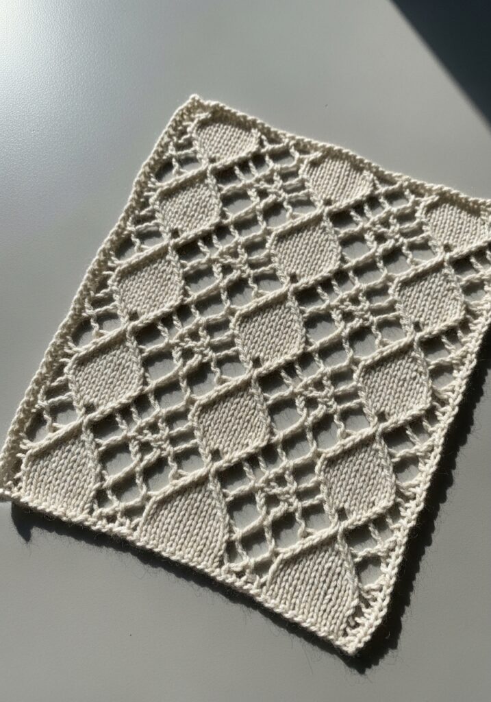 This absolutely gorgeous knitting swatch is giving vintage heirloom vibes in the most beautiful natural cream yarn that looks warm, soft and totally timeless. The pattern creates a repeating diamond grid of open eyelets with solid stockinette ovals nestled inside each diamond shape, and the overall effect is just breathtaking in the most delicate and intricate way. The open lacework lets light filter right through the fabric, casting the prettiest little shadows underneath the swatch, and you can really see how airy and lightweight the finished fabric would be. The yarn looks like a fine fingering or lace weight with a smooth, slightly matte finish that lets every single eyelet and stitch definition show up crisp and clear, which really makes the geometric pattern pop beautifully.
