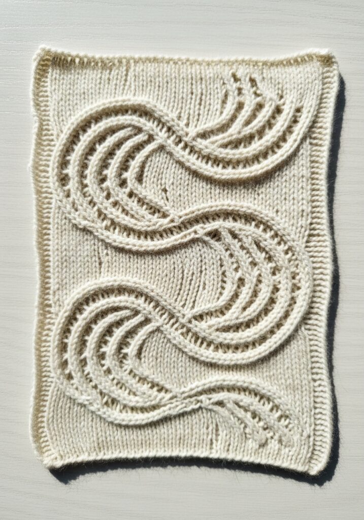 This dreamy knitting swatch is honestly one of the most uniquely beautiful things I have ever seen worked up in yarn, and the warm cream color makes it look like something straight out of a vintage French textile museum. The design features large, sweeping curved cable lines that flow and swirl across a smooth stockinette background in the most organic, almost painterly way, creating shapes that look remarkably like elegant paisley or feather motifs. Each curved cable strand is raised and dimensional, casting the most gorgeous little shadows against the background fabric that make the whole piece look almost sculptural when the light hits it just right. The yarn appears to be a soft, slightly fuzzy light worsted weight with a natural, undyed quality to it that gives the whole swatch this wonderfully artisan and handcrafted feel.