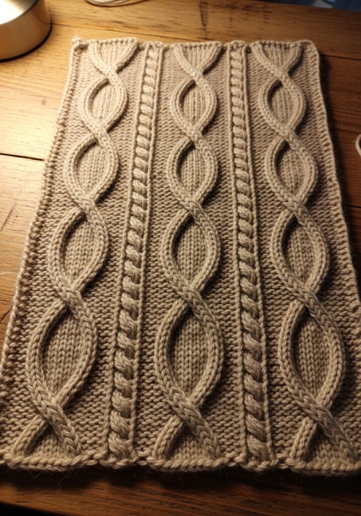 This incredibly rich and textured knitting panel is giving cozy cabin weekend energy in the most beautiful warm taupe yarn that looks like it was literally spun from autumn itself. The design features multiple vertical cable columns running side by side across the full width of the piece, each one showcasing a repeating oval or elongated eye shape that forms where two cable strands cross and separate in the most satisfying rhythmic way. Separating each large oval cable column are narrow twisted stitch ribs that add even more texture and visual interest without competing with the main event. The yarn looks like a smooth, plump worsted weight wool with just enough sheen to make all that gorgeous cable definition photograph beautifully in warm lamplight, and the neutral taupe color lets every single stitch detail shine.