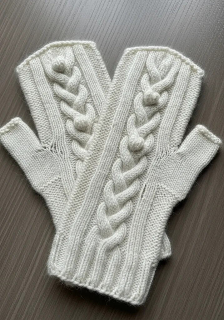 These creamy white fingerless gloves feature bold vertical cable panels that run along the back of the hand. The ribbed cuffs hug the wrists snugly, while the textured cables create a structured and polished appearance. The soft neutral yarn highlights every twist and braid, giving the gloves a clean and elegant finish.