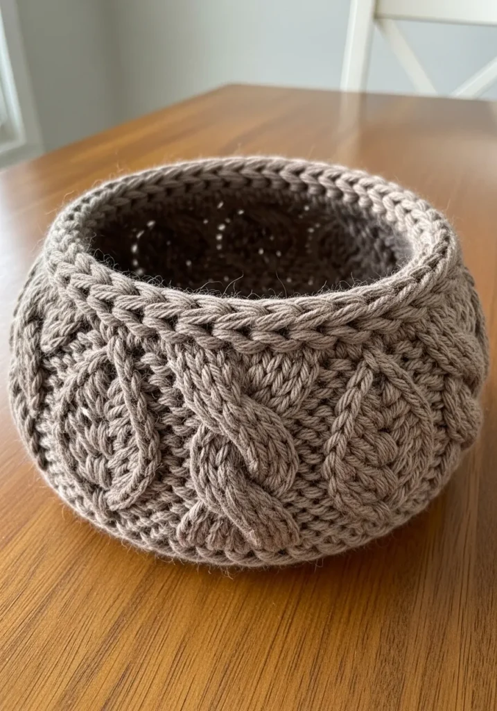 This small knit basket is worked in a warm taupe yarn with thick, sculpted stitches that form bold cable and braided patterns around the sides. The dense texture gives the basket structure and stability, while the rounded shape keeps it soft and inviting. The interior looks neatly finished, making it both decorative and functional.