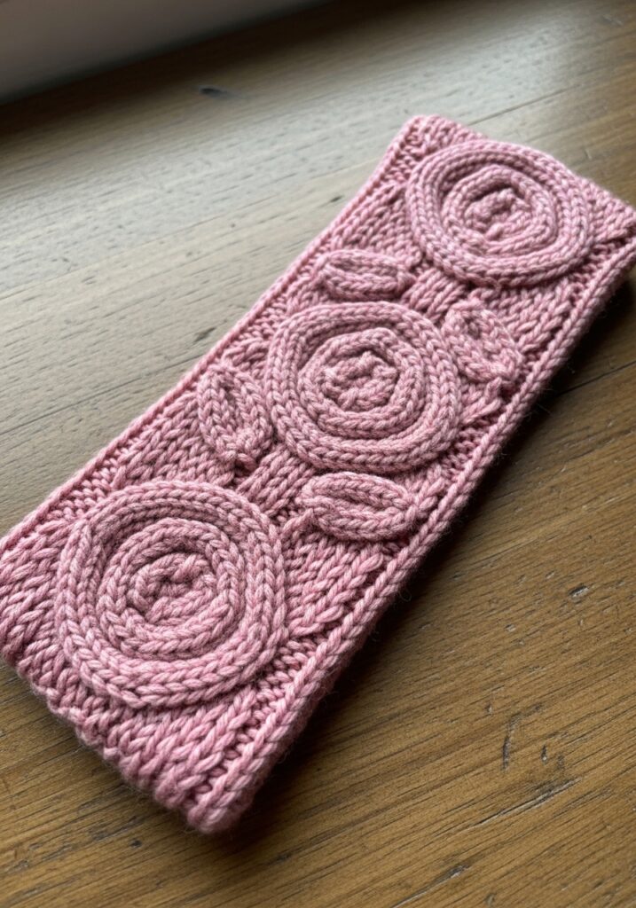 This gorgeous headband is knitted in a soft dusty rose yarn that gives it such a romantic, vintage feel. The standout feature is the raised spiral cable motif that looks just like blooming roses arranged diagonally across the band. Between the roses, you can spot lovely leaf-shaped cable details that make the whole design feel lush and garden-inspired. The texture is incredibly dimensional and rich, which honestly makes it look way more expensive and complicated than it probably is. It’s the kind of piece that makes people stop and ask “wait, you made that yourself?!”
