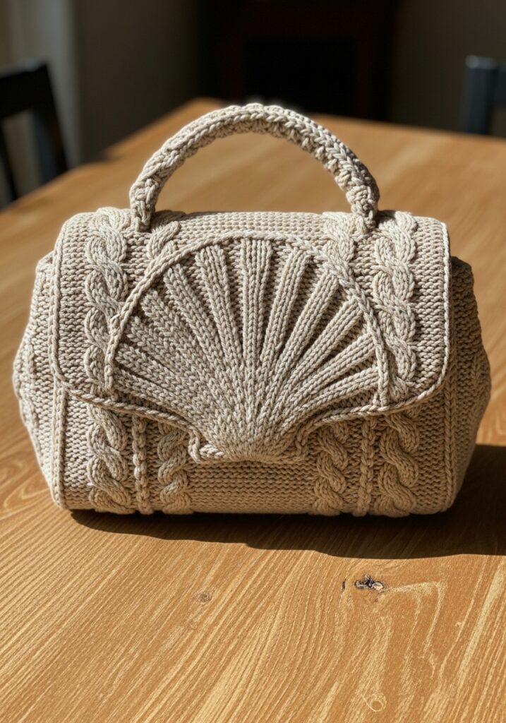 This handbag is genuinely one of the most jaw-dropping knitted accessories I have ever seen and I am not exaggerating even slightly. It’s worked in a firm sandy beige cotton yarn that gives it a really structured, polished shape that holds its form beautifully, like a proper handbag rather than a floppy knitted pouch. The flap closure features the most incredible raised seashell or fan motif right at the center, with lines of stitches radiating outward from a central point in a way that looks almost architectural. Flanking the shell on both sides are thick rope cable panels that frame the design perfectly, and the same cables wrap around the sides of the bag giving it a really cohesive, fully designed look from every angle. The top handle is worked in a neat twisted cord or cable that feels intentional and refined, and the whole bag has this wonderful sculptural quality that makes it look far more expensive than any handmade item has any right to look.