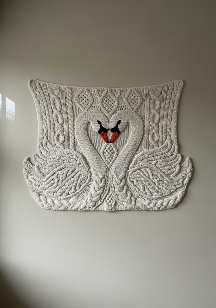 I have seen a lot of impressive knitting in my life but this swan wall hanging genuinely stopped me in my tracks and I am still not fully recovered. It’s worked entirely in a soft ivory white yarn that gives the whole piece an ethereal, almost sculptural quality, like something carved from marble but somehow also impossibly soft and textile. The two swans face each other with their long graceful necks curving inward to form a perfect heart shape at the center, and the detail in their bodies is just extraordinary, with layered cable panels building up the wings in a way that captures the overlapping feather texture so beautifully you almost expect them to ruffle. The background panel behind the swans is filled with vertical cable columns, diamond motifs and honeycomb stitch details that give the whole composition a rich, tapestry-like backdrop, and the only color accent in the entire piece is the tiny orange and black beaks which somehow make everything feel even more precious by contrast. The wings extend outward beyond the rectangular background panel giving the whole piece a shaped, dimensional silhouette that looks completely stunning mounted on a wall.