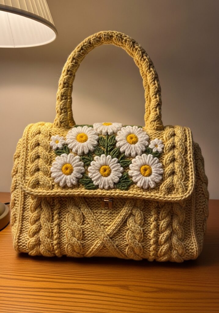 This bag is pure sunshine in handbag form and I want to carry it to every single place I go from now until forever. It’s knitted in a warm butter yellow yarn that has the most gorgeous soft, cheerful tone to it, somewhere between lemon curd and fresh buttercups, and the whole body is covered in a rich braided cable pattern that wraps all the way around giving it a beautifully structured boxy shape. The flap is decorated with the most charming cluster of dimensional daisy appliques in crisp white with bright yellow centers, nestled among little green leaf details that make the whole arrangement look like a tiny garden bouquet sitting right on the front of your bag. A gold hardware clasp at the center of the flap adds just the right touch of polish and practicality, and the top handle is worked in a matching twisted cable that feels sturdy and looks intentionally designed rather than just functional. Every single element of this bag works together so harmoniously that it feels like it was designed by someone who genuinely loves both knitting and fashion in equal measure.