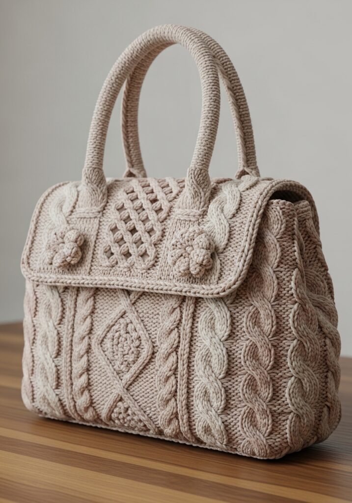 This handbag is the kind of thing that makes you question every purchase you have ever made at a designer accessories counter, because honestly why would you buy one when you could make something this extraordinary yourself. It’s worked in a firm blush linen or cotton blend yarn in the most beautiful neutral tone, somewhere between warm sand and pale rose, that manages to feel both casual and genuinely elegant at the same time. The entire surface of the bag is covered in a rich patchwork of different Aran cable panels, with thick braided cables running up the sides and body, a gorgeous open lattice or mesh cable panel on the flap, a raised diamond motif on the front body, and the most adorable little knot button closures that look like tiny sculptural flowers sitting right on the flap edge. The double top handles are worked in a neat tight stitch that gives them a really solid, polished look, and the whole bag holds its structured boxy shape beautifully thanks to the firm yarn and dense stitch work throughout.